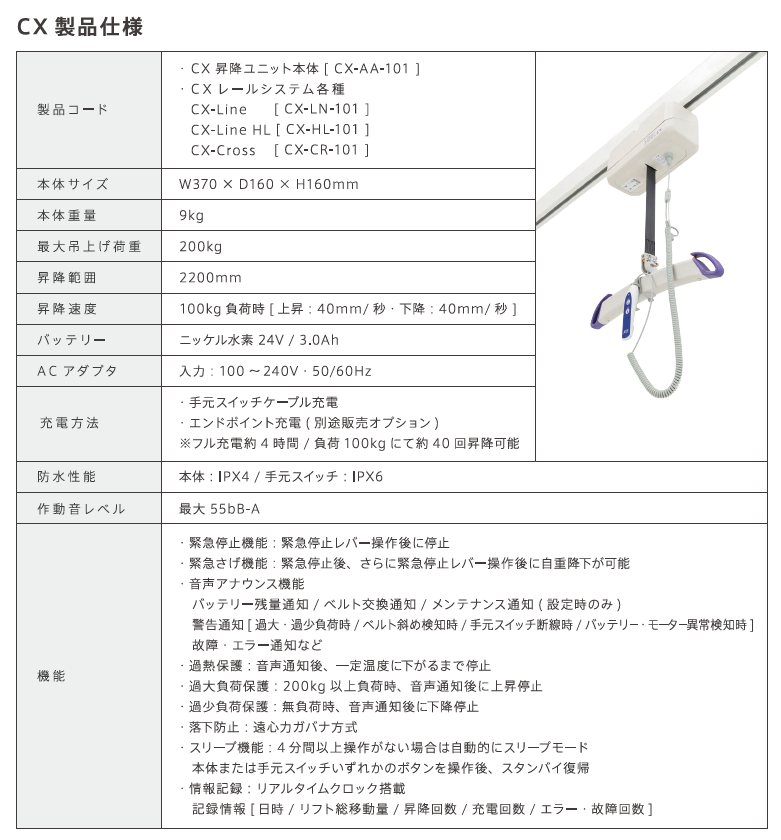 | ●辅助安全使用的语音助手功能 (日语) ●具有防止吊索片脱落的安全闩锁功能的垂吊设计 ●考虑日本沐浴文化和潮湿气候的防潮防滴性能 ● 使用信息记录从而实现维护 |