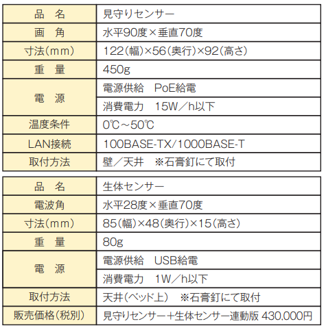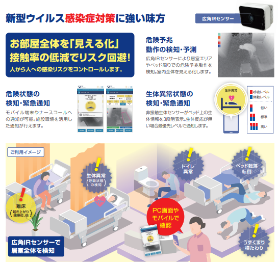 通过采用广角IR传感器,实现了以往的传感器所做不到的以房间全域为对象来进行危险预兆动作,危险动作检知。此外,同时配有生体传感器进行日常监测,从而最大程度上规避重大事故。